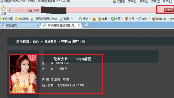 “色情信息是木馬病毒熱衷的傳播介質(zhì),近六成的木馬網(wǎng)站帶有色情內容?!?60工程師指出,“而瀏覽器則是病毒木馬黏上網(wǎng)友的最佳入口?!币浴?D肉蒲團”為例,網(wǎng)友因為獵奇心理在互聯(lián)網(wǎng)搜索“3D肉蒲團 下載”等等關(guān)鍵詞,而病毒制造者卻早已是“螳螂捕蟬,黃雀在后”。一旦用戶(hù)點(diǎn)擊進(jìn)入被設下“十面埋伏”的特殊網(wǎng)站“偷窺”,后果可想而知。不僅個(gè)人信息會(huì )被網(wǎng)站設置的木馬程序反偷窺,還會(huì )導致上網(wǎng)密碼、游戲賬號、股票賬號甚至網(wǎng)上銀行賬戶(hù)等不翼而飛。