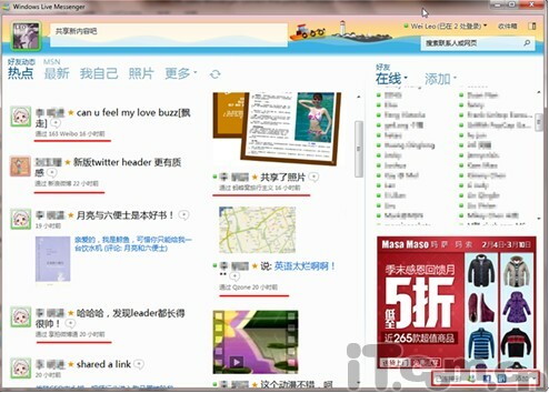 目前,使用Windows Live Messenger 2011的用戶(hù)可以在“社交面版”或“簽名狀態(tài)”看到好友通過(guò)MSN連接綁定Windows Live Messenger后發(fā)布在新浪微博或其他社交網(wǎng)站的信息。