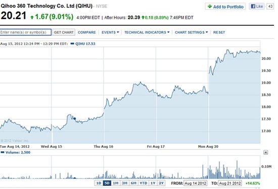 360最近股價(jià)大幅提升,截止今日360收盤(pán)價(jià)位20.21美元,上漲1.67美元,漲幅高達9.01%。自360傳出做搜索以來(lái)其股價(jià)已持續上漲。