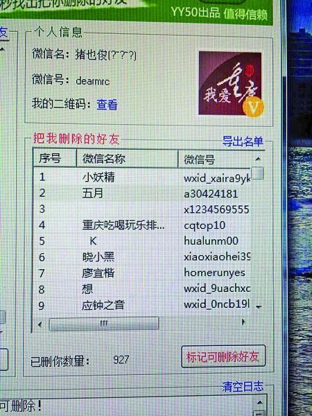 “原來(lái)我微信里躺著(zhù)這么多‘尸體’。”昨日下午,草根微博大號“我愛(ài)重慶”陳泓宇也用該軟件對個(gè)人微信號“豬也俊”進(jìn)行了測試,結果在3697位好友中,已有927位好友將他刪除。他忍不住自嘲:“為什么要刪我?大概是因為我刷屏、自拍和長(cháng)得丑吧。”
