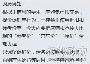 商家截圖顯示,京東已經(jīng)發(fā)布緊急通知,稱(chēng)工商局要求,一律禁止電商平臺使用折扣和參考價(jià)等信息,因此,商家必須在今天內把店鋪和承接頁(yè)面出現的所有“參考價(jià)”“京東價(jià)”“原價(jià)”等字眼全部去掉;商家只能保留促銷(xiāo)價(jià)。