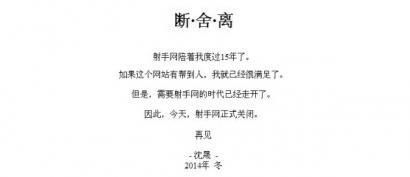 22日,知名字幕分享網(wǎng)站射手網(wǎng)創(chuàng )始人沈晟發(fā)表了一則名為“斷·舍·離”的公告,宣布“射手網(wǎng)正式關(guān)閉。”